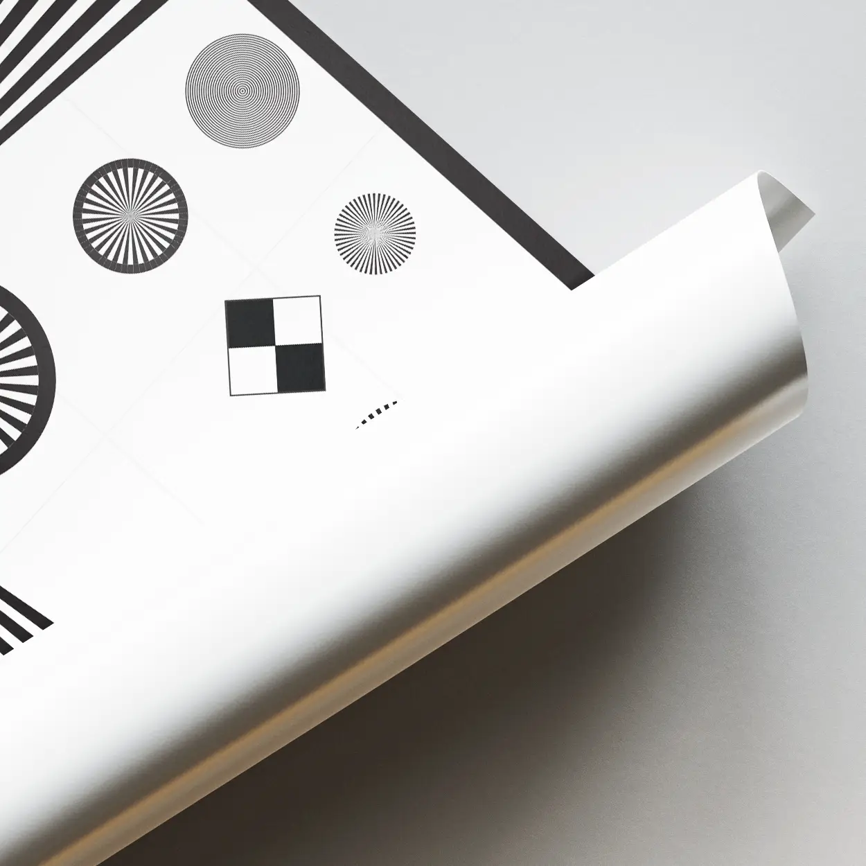 The distortion and geometry specialist. This chart emphasizes linear patterns and geometry, making it perfect for rapidly identifying pincushion, barrel, and complex lens warping. Download, print, and save hours of frustration in post-production.